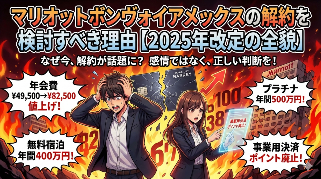 2025年8月のマリオットボンヴォイアメックスの大幅改定を受けて、こんな不安を感じている方は少なくないはずです。年会費は49,500円から82,500円へ。無料宿泊特典の獲得条件は年間150万円から400万円へ。「改悪」と言わざるを得ない内容でした。
