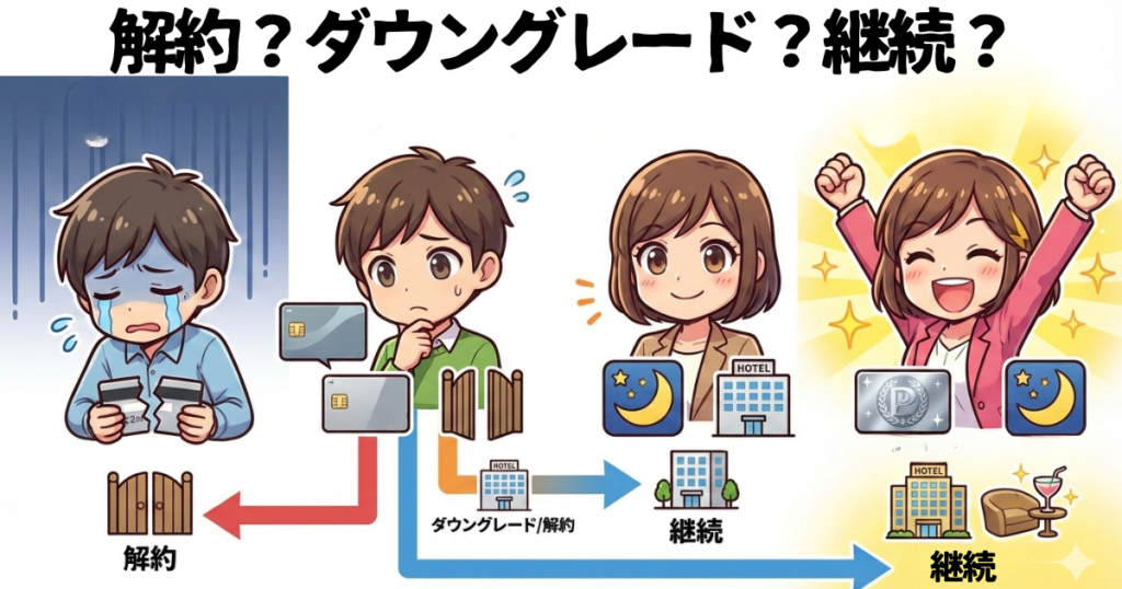 無料宿泊特典には届きませんが、ゴールドエリートだけでも価値を感じる方は、年会費34,100円の一般カードへのダウングレードも選択肢。