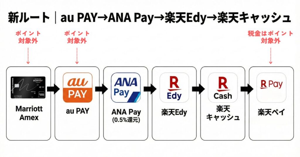 - 新ルート(au PAY→ANA Pay→楽天Edy→楽天キャッシュ)で楽天経済圏を活用
