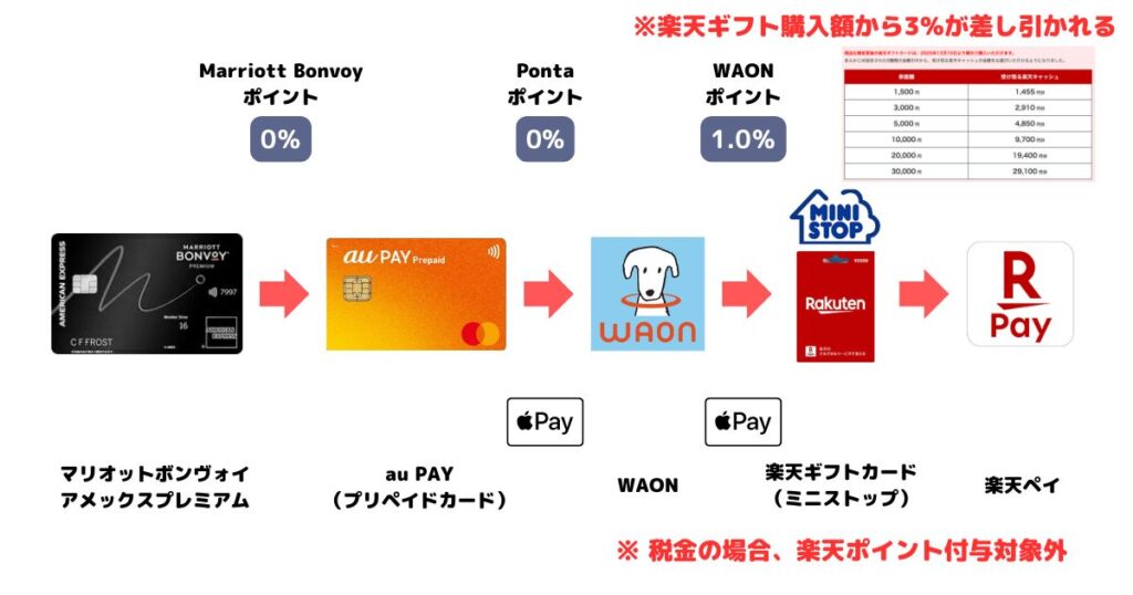 マリオットボンヴォイアメックスの強みは、通常決済時の高いポイント還元率(プレミアムで3%)です。しかし、税金支払い時はわずか0.5%に低下してしまうため、いかに高い還元率を維持できるルートを選ぶかが重要です。