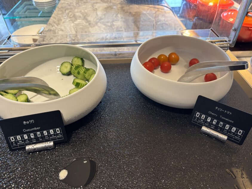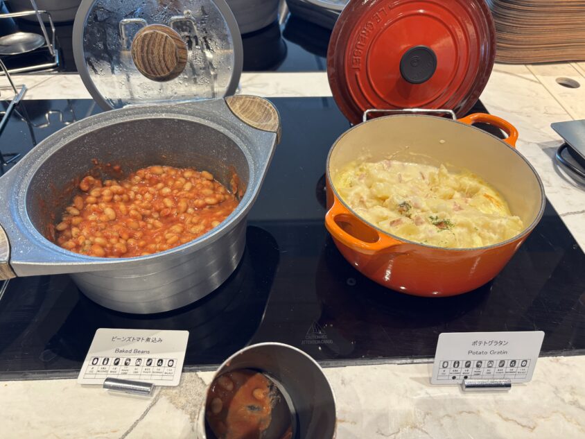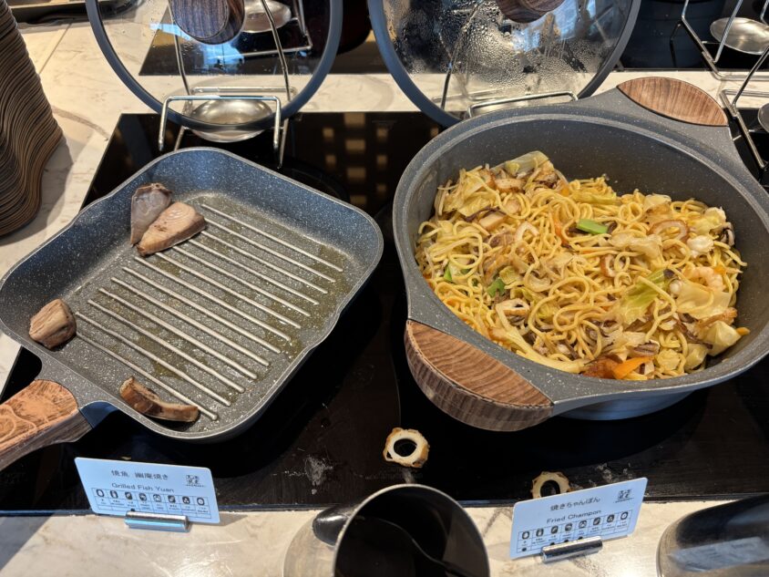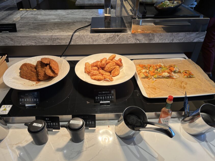 角煮まん・がんころもち・アジフライなどのホットミールに加え、チーズやコールドフードも揃っているので、大人2人なら十分メインの食事として満足できるボリュームです。ただし、メニューの種類は他のマリオットと比較するとコンパクトなので、がっつり食べたい方は外食との組み合わせもおすすめです。