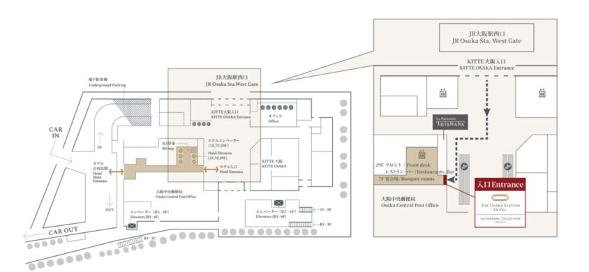 JPタワー大阪の地下駐車場が利用可能です。宿泊者は割引料金で利用できます。JR大阪駅西口直結なので、電車でのアクセスが最も便利です。